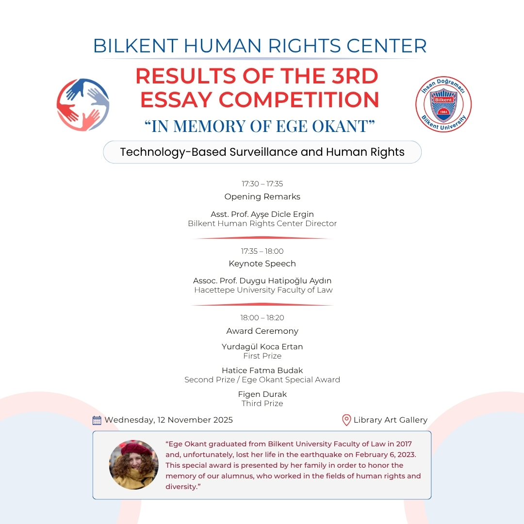 The results of the third annual essay competition organized by the Bilkent Center for Human Rights have been announced. This year’s competition addressed the theme of “Technological Surveillance and Human Rights.” We would like to congratulate the award recipients!